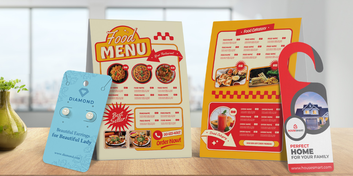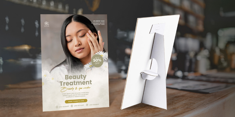 Strut cards are a fantastic, versatile option for displaying promotions, special offers, or new product launches. Place them at eye level on counters, shelves, or tables to maximise visibility and draw attention to key areas in your store. Strut cards are sturdy, easy to set up, and can be designed to match your store’s aesthetic on Canva. With striking graphics and clear messaging, these compact cards become a powerful tool for communicating directly with your customers.